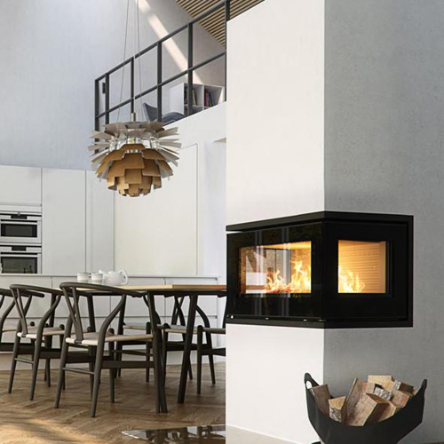 Glass on one side creates a simple and classic solution, fits most homes and existing open fireplaces. You can choose between a steel frame and a clear glass surface for the door and sides for all three versions. All come with a right- or left-hand door. Further, you can choose your connection to the Air System – through the bottom or rear wall. The handle is comfortably cool. RAIS 500 keeps the windows nice and clean when properly fired.