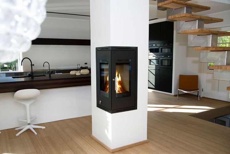 This elegant insert rounds off a corner in the most beautiful of ways and is equipped with a single-piece glass door. Q-Be is much more than just one fine corner in your home, it is a sign of good taste in the spirit of minimalism. The large glass door offers a fantastic view of the flames. The handle is located under the stove so nothing disrupts the simplicity of the design. The Q-Be insert can be ordered either with a glass door or a glass door in a steel frame.