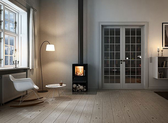 Introducing the NEW Rais Q-Tee 85 Wood Burning Stove. A small, functional and simple stove with a cubist look, the Q-Tee is an ideal wood stove for a small room. This DEFRA approved wood stove has an air-cooled handle and sturdy closing system and an integral log store feature. You can choose the basic model and place it on the floor or on a floor plate – or you can emphasise the wood stove by placing it on a bench e.g. non combustible base. It is ideal size for fitting in a small fireplace opening too.